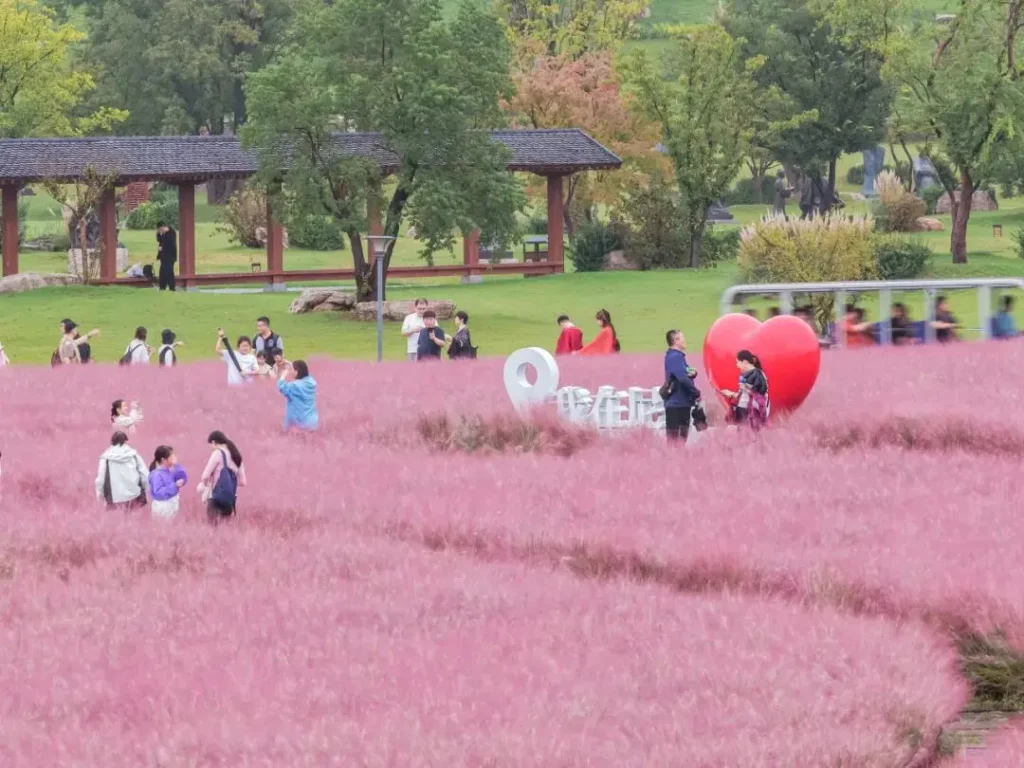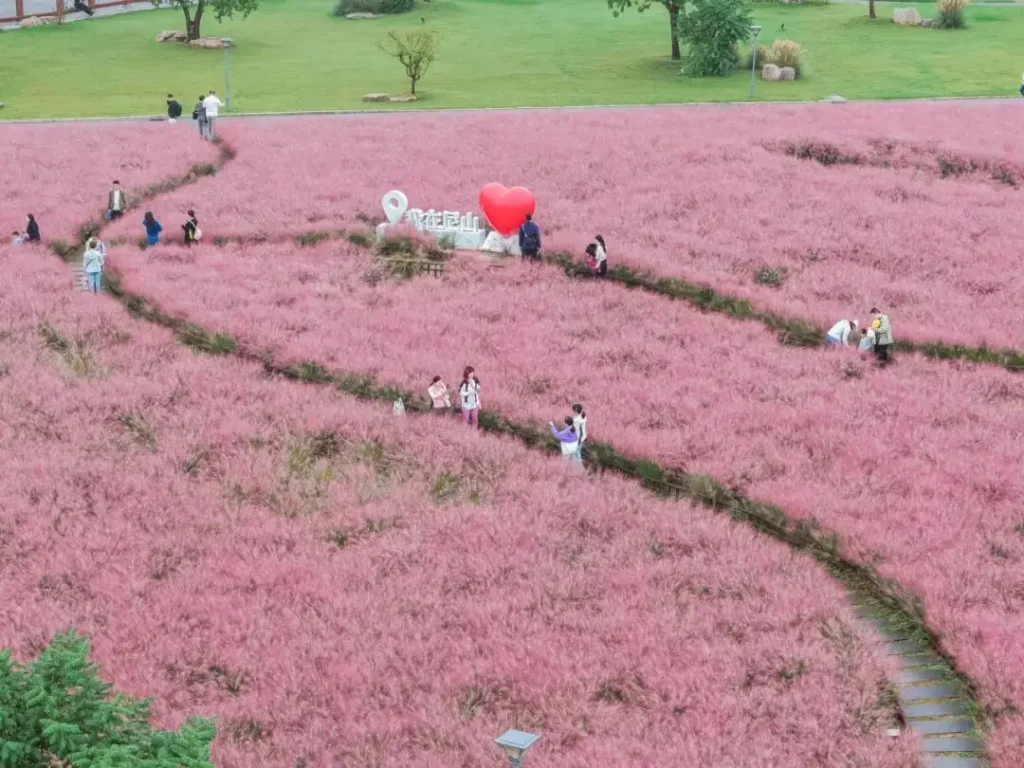 走在花叢中的小徑,粉色花海隨風搖曳,如夢似幻,尼山聖境的秋日浪漫指數直接拉滿!