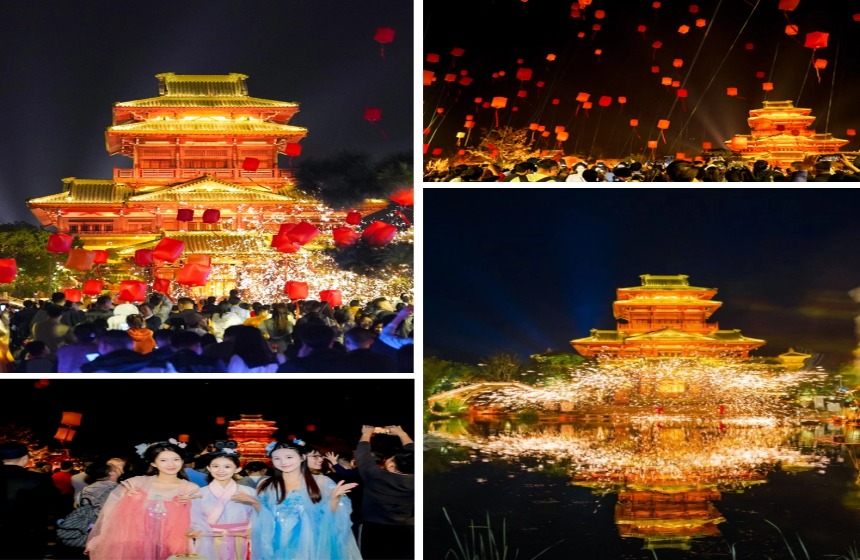 在魯源村澤木廣場,定格秋夜夢幻時刻,提壹盞孔明燈,放飛心願,祈願好運。與此同時,匠人將鐵水潑向夜空,綻開漫天華彩,與點點明燈交織,共繪這秋夜獨有的浪漫畫面。