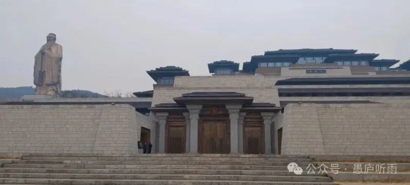 孔子像,2015年12月,孔子像正式落成。由雕塑家吳顯林主持設計,參考唐代吳道子《先師孔子行教像》,通過手工鍛打720塊銅板精密拼接而成(用量150噸),面容栩栩如生。‌‌孔子像高72米,代表孔子弟子72賢,基座18米寓意儒家文化根基。在孔子像前留影,顯得特別渺小。