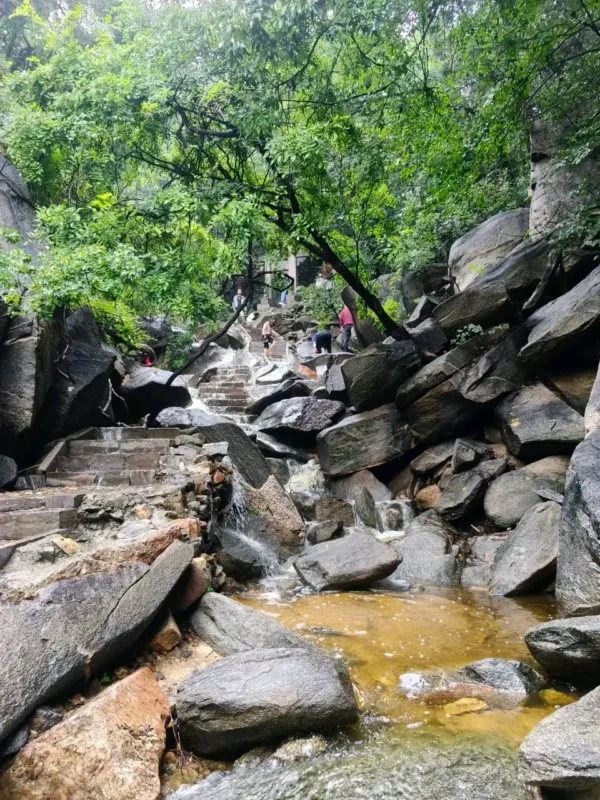 我是周六早上從濟南自駕出發的,約2小時抵達石門山,剛到景區門口,就被清新的空氣吸引了,與濟南的霧霾天氣完全不同,空氣中彌漫著草木與泥土的清香,讓人瞬間放鬆下來。當天剛下過一場小雨,山間雲霧繚繞,仿佛人間仙境。沿著步道上山,腳下的青石板路被雨水打濕,格外乾淨,兩側的樹木枝葉繁茂,雨水順著葉子滴落,發出輕輕的聲音,搭配著溪水的叮咚聲,簡直是天然的白噪音。