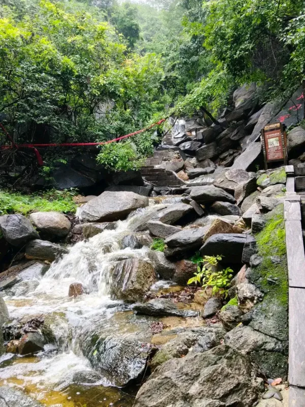 第一步:山門廣場→生態步道(約30分鐘)。從山門進入後,沿著青石板鋪設的生態步道前行,沿途兩側是茂密的森林,油松、側柏參天聳立,山桃、連翹點綴其間,雨水過後,每片葉子都晶瑩剔透,陽光灑下,光影斑駁,十分迷人。步道旁設有指示牌,標註著各個景點的方向,沿途還有小型涼亭,可短暫休息。