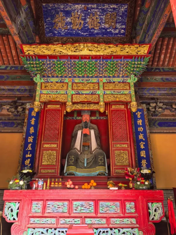 第四步,三進院落參觀元聖殿與東西配廡。穿過達孝門即進入三進院落,這裡是周公廟的核心區域。首先參觀元聖殿,欣賞其單檐歇山綠琉璃瓦頂的建築風格,殿內的周公與伯禽塑像、乾隆御書的明德勤施匾額均為核心景點。殿外露台兩側的東西配廡,面闊五間,懸山灰瓦頂,可參觀其中的文物陳列。